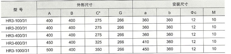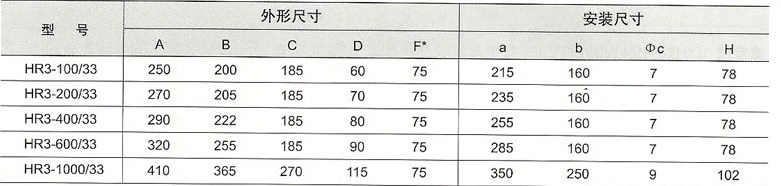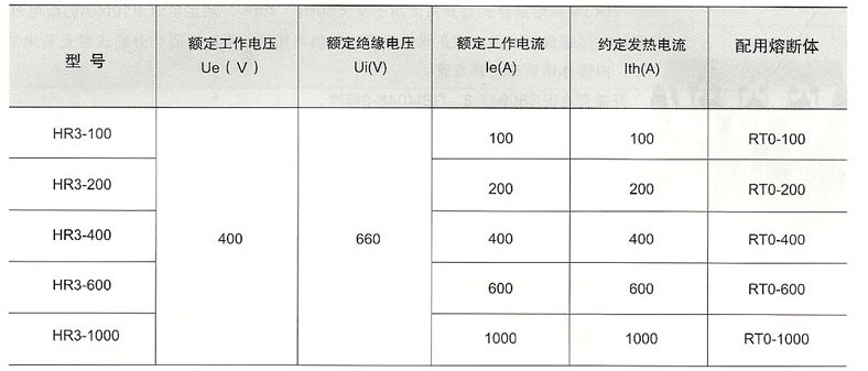二:型号及含义 约定发热电流(A) 交流400V HR3 正面侧方械杆传动机构方式 HR3正面中央杠杆传动机构式 HR3侧面操作手柄式 HR3无面板正面侧方杠杆传动机构式 100 HR3-100/31 HR3-100/32 HR3-100/33 HR3-100/34 200 HR3-200/31 HR3-200/32 HR3-200/33 HR3-200/34 400 HR3-400/31 HR3-400/32 HR3-400/33 HR3-400/34 600 HR3-600/31 HR3-600/32 HR3-600/33 HR3-600/34 1000 HR3-1000/31 HR3-1000/32 HR3-1000/33 HR3-1000/34