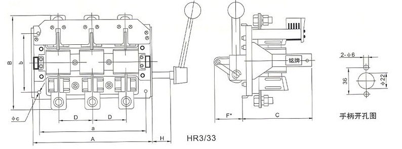 1.HR3熔断器式刀开关是熔断器和刀开关的组合电器,具有熔断器和刀开关的基本性能,在电路正常供电的情况下,接通和切断电源由刀开关来担任。当线路或用电设备过载或短路时,熔断器的熔体烧断,及时切断故障电流。前操作前检修的开关,中央有供检修和更换熔断器的门,主要供BDL配电屏上安装。前操作后检修的开关主要供BSL配电屏上安装。侧面操作前检修的开关可以制成封闭的动力配电箱。