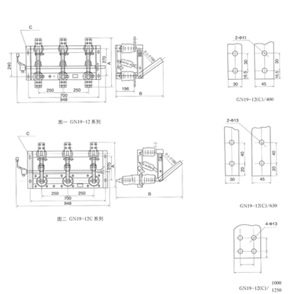 GN19-12(C)系列户内交流高压隔离开关适用于交流50Hz,额定电压12kV及以下电力系统中,配用型人力操作机构,作为在有电压而无负载情况下,分合电器之用,亦有派生产吕防污型、高原型和可加装带电显示装置等。