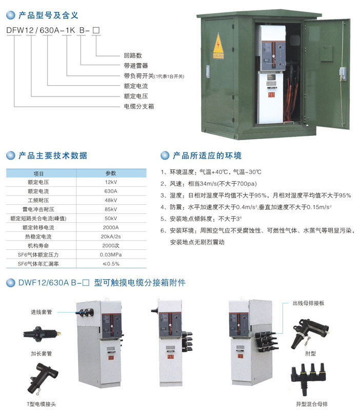 一、带开关高压电缆分支箱,专用于交流12kv电缆系统的电缆节点处,用以分配电能。其联接方式简单、方便,具有全绝缘、全密封、耐腐蚀、免维护、安全可靠、体积小、重量轻、造型美观、无油化、安装简单、接地灵活、无任何带电部分裸露等特点,解决了电缆“T”接、环网供电多路进出线等难题。产品形式可分为带开关分支箱,欧式分支箱和美式分支箱。其进出线电缆连接均采用全绝缘型电缆接头;安装简便,使用可靠。外箱表面均采用静电喷塑工艺加工,美观,大方,可按不同的环境选择不同的颜色加工。箱内均具有相应的电缆固定夹及接地端子。 |