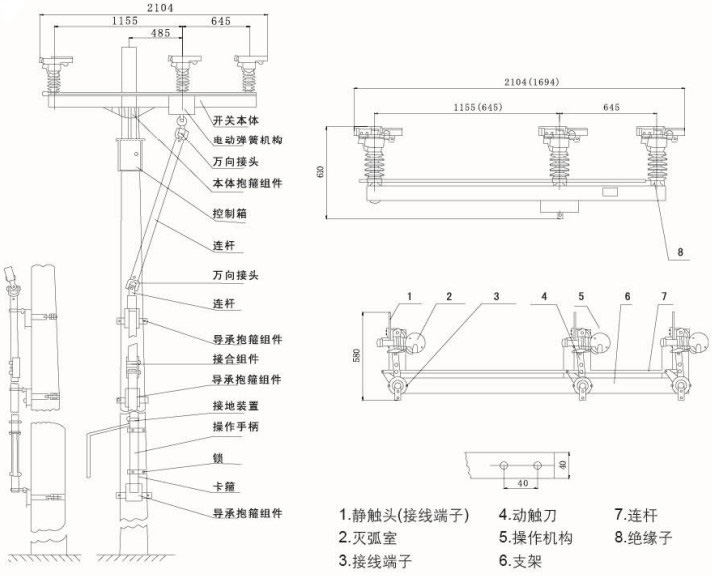 该隔离负荷开关由隔离闸刀、灭弧室及操动机构等部分组成。采用压气产气灭弧原理,具有结构简单、少维护、灭弧能力强、断口绝缘水平高、可靠性高等优点,达到国外同类产品的水平。